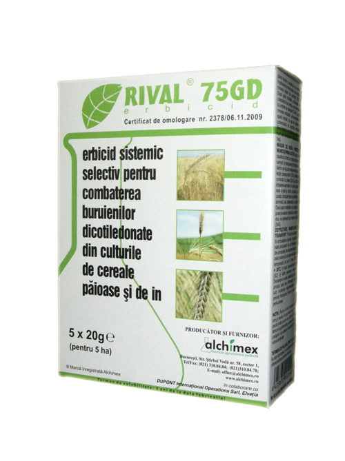 Nu putini sunt aceia dintre dumneavoastra care va confruntati an de an cu buruienile din culturile de cereale. Si asta chiar din toamna, imediat dupa semanat. Pentru a nu mai avea astfel de probleme, Alchimex va recomanda sa utilizati Rival 75 GD (clorsurfuron 75%), comercializat de catre compania Alcedo. Rival 75 GD este un preparat sub forma de granule fine, omogene, fara tendinta de sfaramare, de culoare cafenie, dispersabile in apa.